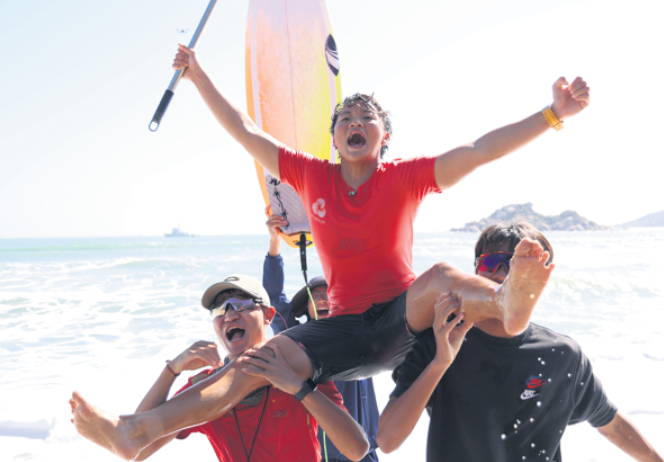 During the four-day surfing competition, held from Nov 13 to 16 at Qing'ao Bay on Nan'ao Island in Shantou, Guangdong province, the weather alternated between sunny and overcast, with waves ranging from powerful to choppy. However, for Sunday's final, the bay experienced the best conditions of the entire four-day event, with clear skies and consistent swells, providing Yang with a stable platform to showcase her high-flying jumps and explosive turns on the waves.