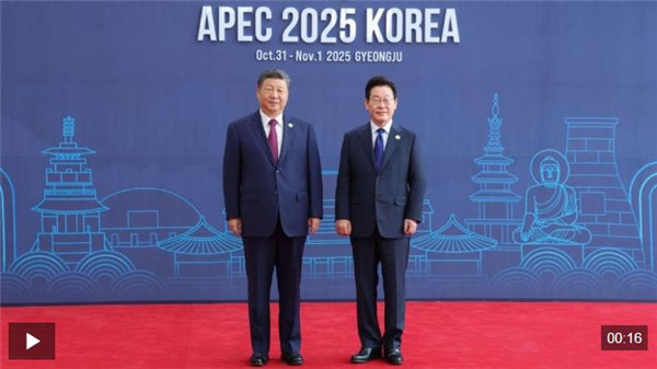 习近平主席抵达时,韩国总统李在明热情迎接。两国元首握手、合影,留下珍贵的“APEC瞬间”。随后,两位领导人微笑交谈,共同步入会场。