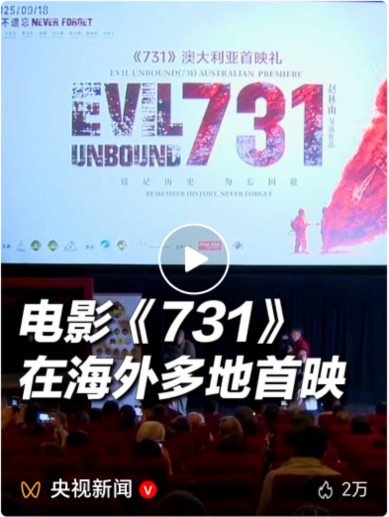 当地时间9月18日,电影《731》在澳大利亚多地上映,并于当晚在悉尼和墨尔本举行首映活动。