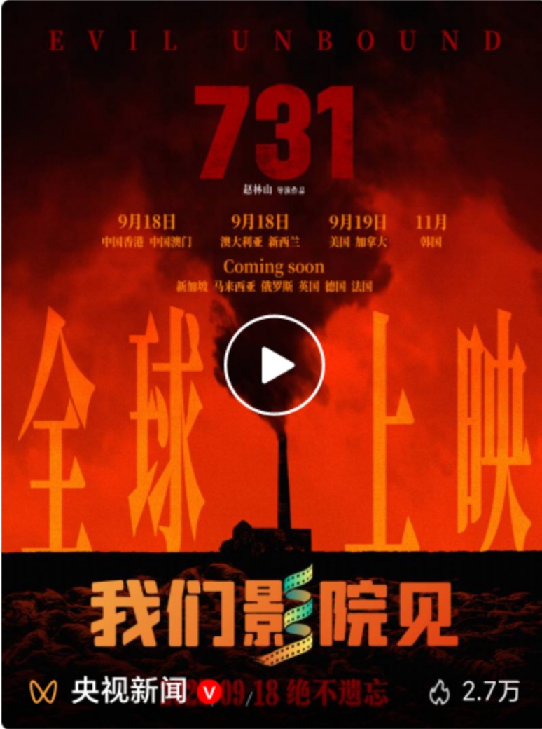 9月18日,电影《731》在全球多地首映。当天,央视新闻举办了《731》专场观影活动。据网络平台数据,截至9月19日20时30分,电影《731》总票房(含预售)已超6.6亿元。