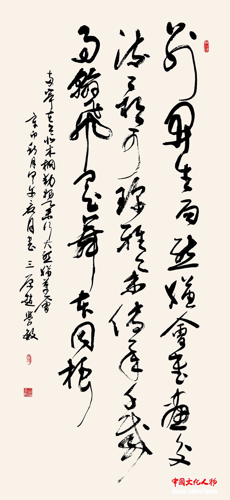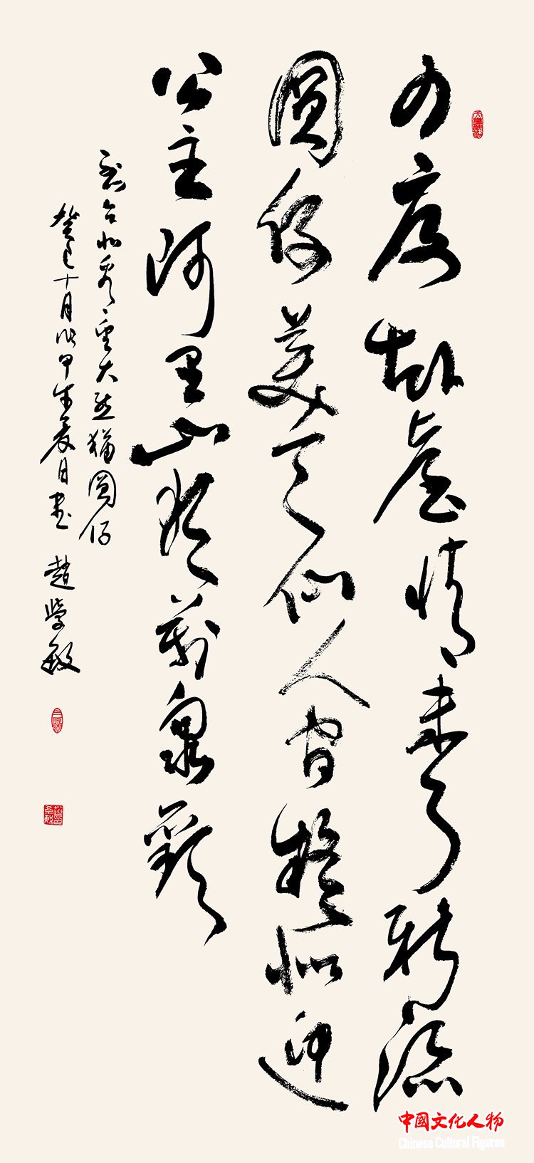 赵学敏先生系陕西三原人。作为于右任先生同乡后辈,他少时得于公秘书李楚材亲授,数十年深耕书艺,形成“碑骨帖韵”的独特风格——楷书取法《张猛龙》《郑文公》等北碑,笔力沉厚宽博;草书承于右任标准草书精髓,融合怀素、黄庭坚等诸家之长,达到“豪放而不失法度,自由而仍有归依”的艺术境界,正如书法评论家所言“学于而能化于,出入古今自成格调”。