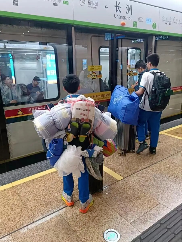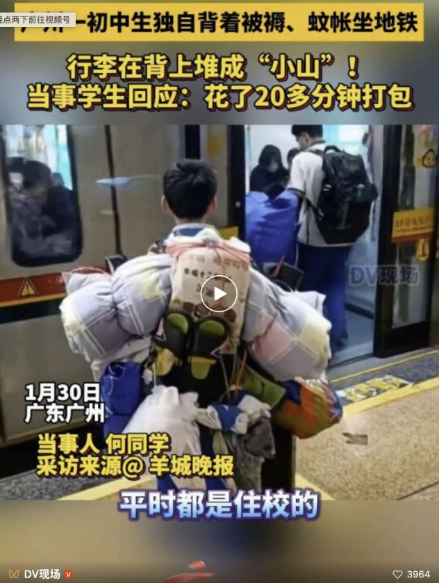 1月30日,广州中小学迎来寒假。在广州地铁7号线长洲站,有市民拍到一名学生独自背着鼓鼓囊囊的行李候车,被褥、蚊帐、运动鞋、拖鞋层层叠叠,甚至还有一只被行李完全包围住的“大湾鸡”。这名学生哥的背影几乎被身上堆成小山的行李吞没,背包带也深陷进他的肩膀。