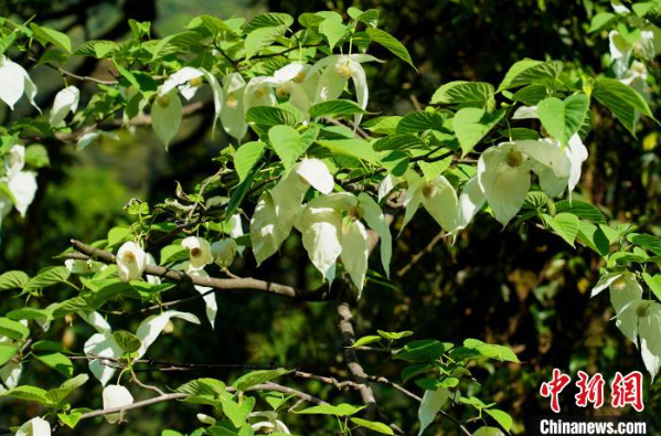 时事聚焦4月20日,四川省雅安市荥经县龙苍沟镇的山谷中,大片野生珙桐树沿着山谷两侧或单棵,或成团,或成片美丽绽放。珙桐花又叫“鸽子花”,是国家一级重点保护野生植物,有“植物活化石”“绿色大熊猫”之称。荥经县境内有30万亩野生珙桐林,有着“鸽子花都”的美誉。图为珙桐花随着习习微风摇曳风中。中新社记者 吕杨 摄 图为盛花期的珙桐花开满树枝,与绿叶相互映衬。中新社记者 吕杨 摄...