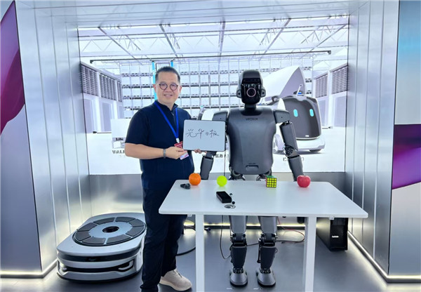 開場的兩個萌型機器人,為此次參觀活動奠定了輕鬆活躍的氛圍,華文媒體社長總編輯們積極與機器人互動,感受到了人形機器人非凡的魅力。在智慧物流核心產品展區,有一個機器人可以精準識別物品並抓取至指定位置,還能通過多個攝像頭看到周圍發生的事情,精準描述當時嘉賓們進行參觀與聆聽的場景。馬來西亞《光華日報》署理總經理林星發在白板上寫下「光華日報」四個字給機器人看,它立刻讀了出來,讓在場嘉賓忍俊不禁。