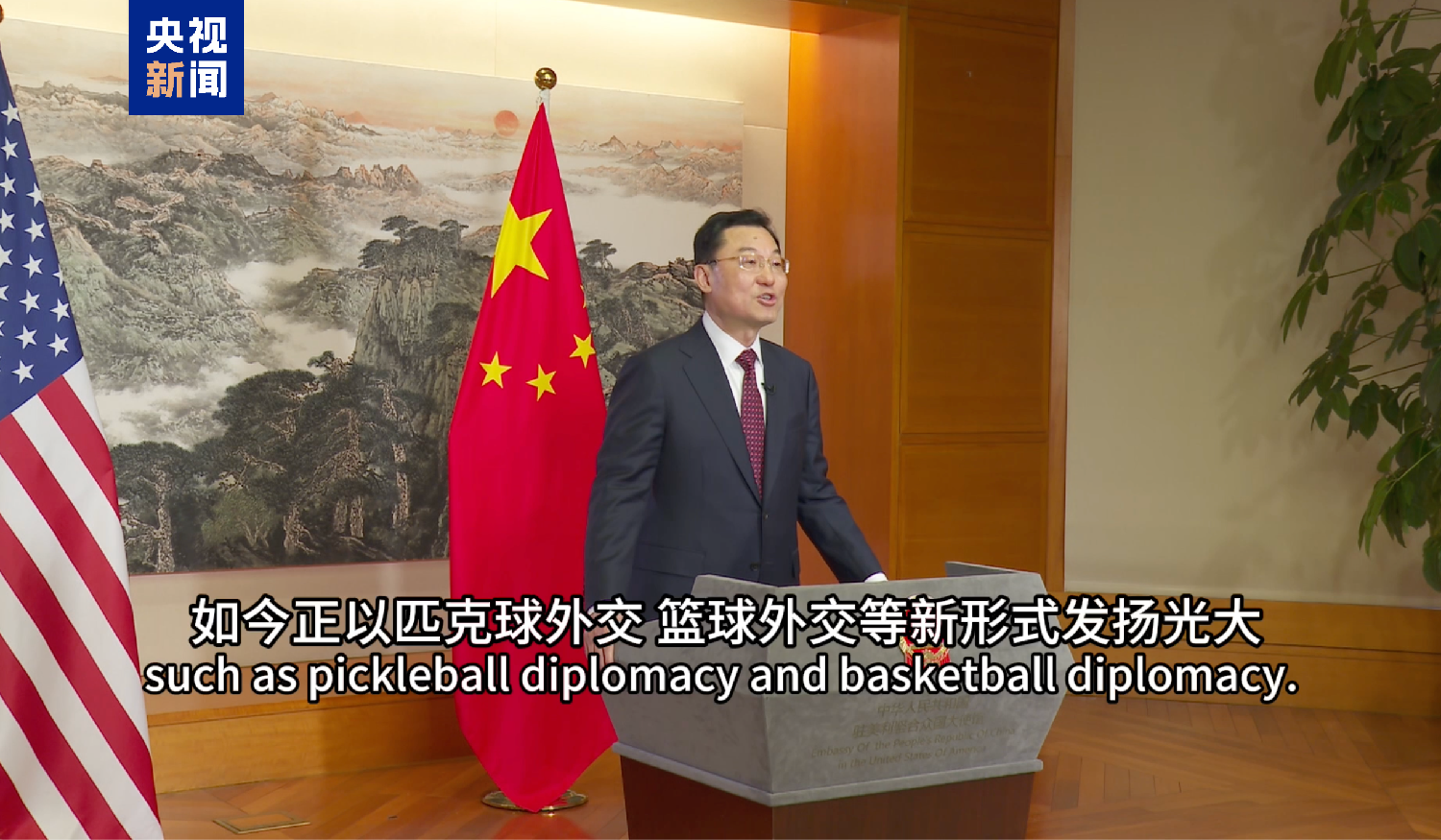 谢锋表示,55年前的“乒乓外交”,打开了两国人民友好交往直至两国关系发展的大门。此次活动融合了一份佳节和一段佳话,寓意美好。“乒乓外交”代表中美人民相互走近的精神,如今正以匹克球外交、篮球外交等新形式发扬光大。包括林肯中学学生在内的4万多名美国青少年参加“5年5万”倡议赴华交流学习,成为跨越太平洋的“友谊使者”。期待中美双方在两国元首战略引领下,秉持相互尊重、和平共处、合作共赢原则,保持马不停蹄的干劲,拿出跃马扬鞭的豪气,激发万马奔腾的活力,把中美关系宏伟愿景一步步变成共赢现实,为两国人民带来更多实实在在的福祉,为世界注入更多稳定性和正能量。